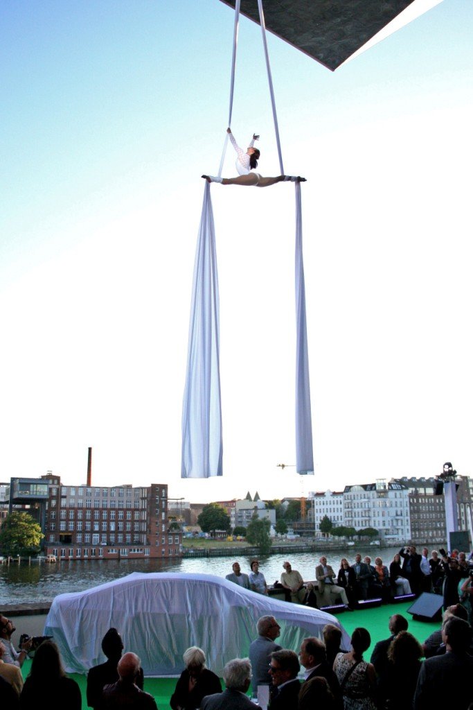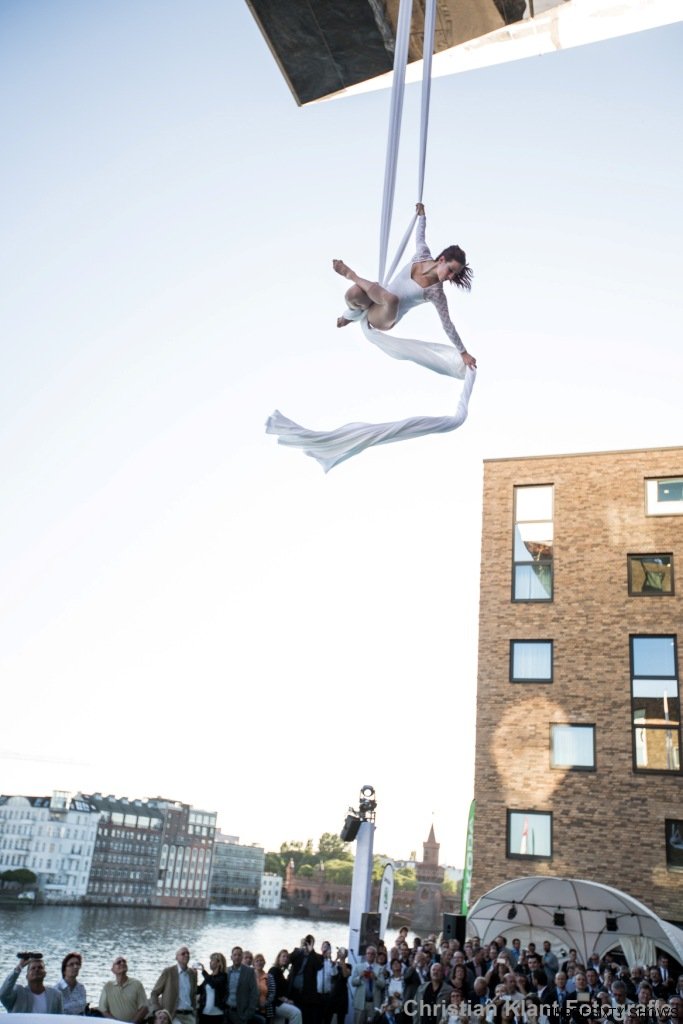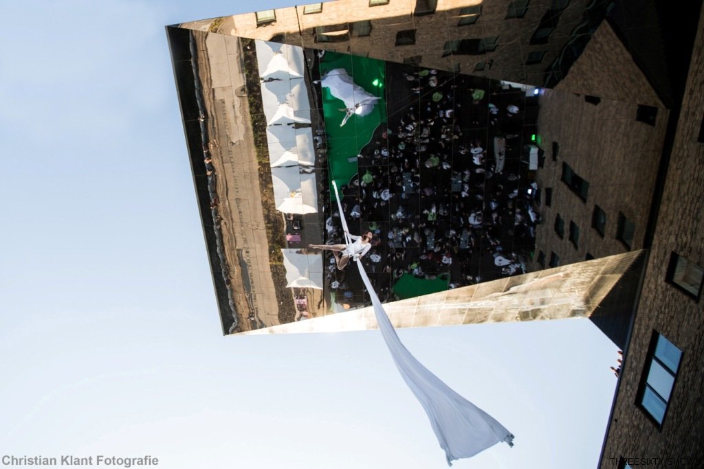 Das Vertikaltuch als Show Element ist eine elegante Möglichkeit um Ihre Kunden zu begeistern. Je nach Location für eine Vertikaltuch Show ist die Länge/Höhe frei wählbar und auch die Tuchfarbe stimmen wir auf Ihr Eventdesign ab.